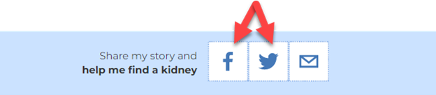 • Send the URL in emails to friends, family and acquaintances. Next to the Facebook and Twitter icons, you’ll see an icon for email. Click that icon to send an email with your microsite address to as many people as possible. Remember: one of the main purposes of the microsite is to prevent you from having to make multiple personal appeals to people. The microsite will do that for you—all you have to do is click the icon, enter email addresses, and write a couple of introductory sentences, such as: “I need a living donor kidney. Please visit my microsite for details.”